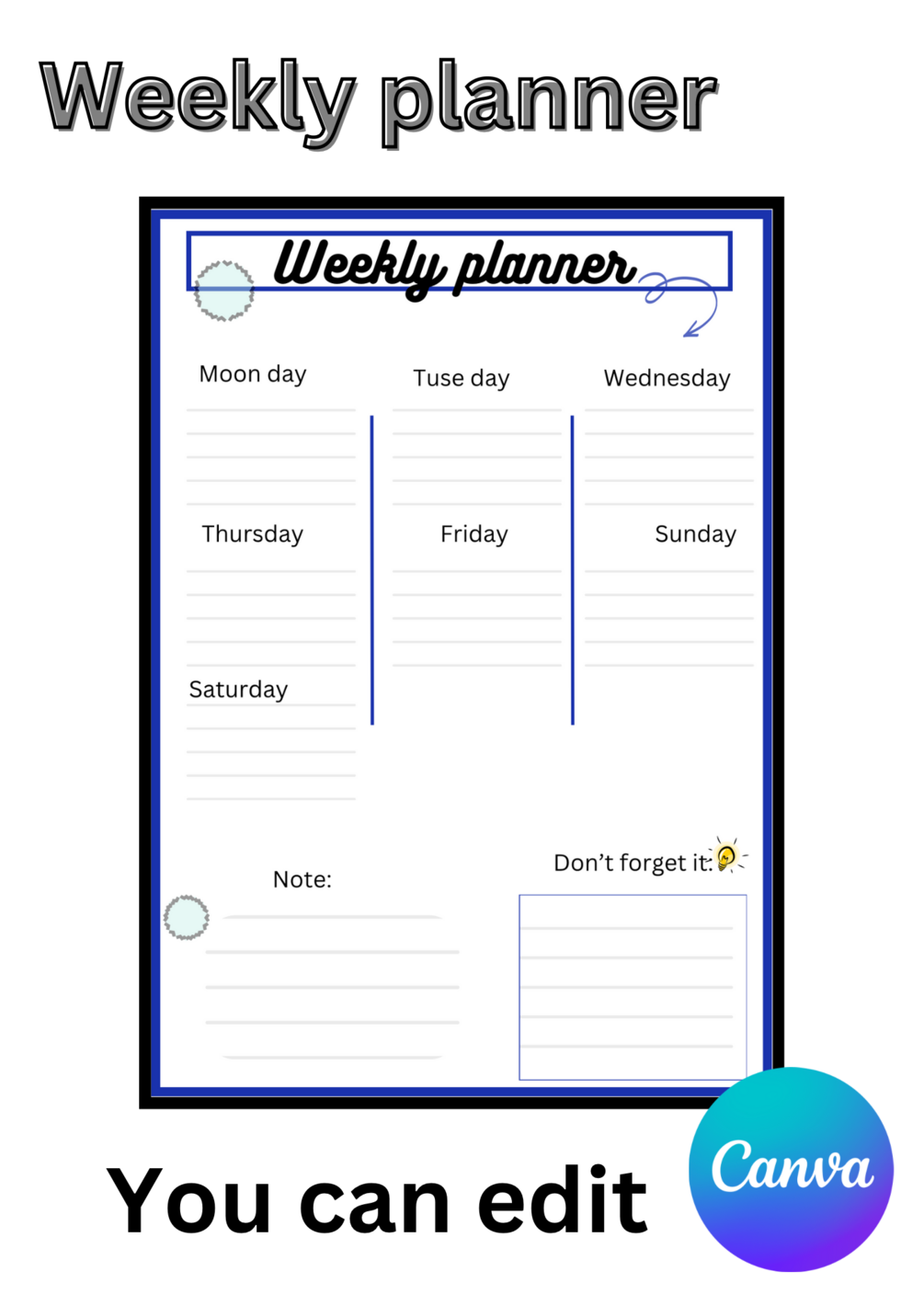 A nice blue and white weekly plan that contains the number of days of the week, a note that should not be forgotten, and a note, and its type is A4.